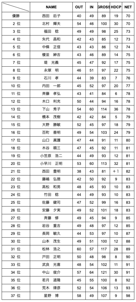 第23回大会から5年の歳月を経て5年ぶり2度目の優勝を果たしたのは、HDCP16、ネット70の2アンダーの西田 后子夫人だった。不思議!