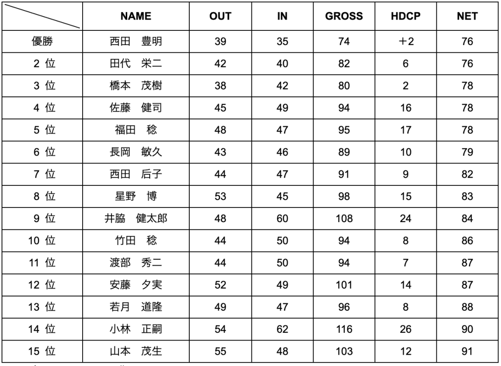 評 | この季節にしては意外と暖かく、風もない大変いいゴルフ日和となった。西田豊明氏がメンバーである富士小山GCで、STG会が開催されるのは初めて30分遅れで、OUTから15名がスタートした。グリーンが速く、むずかしくキャディーさんを頼りに、四苦八苦したが、HDCP+2、39 35 74。ネット76の4オーバーで、百戦錬磨 地主の西田豊明氏がうれしいベスグロ優勝を勝ち得た。2位は千葉のいぶし銀 田代栄二氏。いつもの手堅い安定したゴルフで42 40と、HDCPを縮めた。前半38の橋本茂樹氏は、後半42を打ちうなだれていた。あら、珍しく4位に突如浮上してきた佐藤健司氏。けんちゃんやればできる。もう一息!BMの山本茂生氏は、「先日、他のコンペで優勝したのに……。」と、ぼやいていた。NHKの萩原廣一氏から時計や商品券を提供していただき、また、山本茂生氏からSTG会に50万円の寄付をしていただいた事を報告した。次回は、1月23日伊豆下田での開催を予定。神様、いつも悪天候、恐怖の伊豆下田、どうかいい天気にしてください。 |