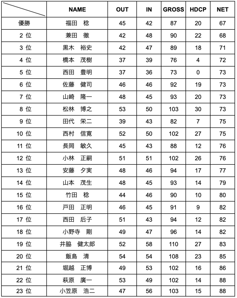 飛び込み参加、黒木裕史氏を含む、24名がゴルフ日和の大多喜城GC東コースをスタートした。久々の参加小笠原浩二氏は活き活きしていたし、「貧乏ひまなし〜。」と、飯島清氏もお目見え。楽しい役者は揃った。前回の伊豆下田でのハンディーキャップ改正で、皆んな2〜3 ハンディーキャップを甘くしたことで、全員新たな気持ちで、挑戦したようだが、条件は同じ‥。しかーし、ここで、どこかで悟りをひらいたHDCP20の福田稔氏が、45 42ネット87。ネット67の5アンダーで堂々優勝を果たした。