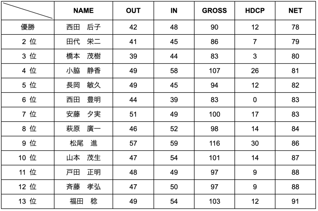評 | 今回の伊豆下田CCでの開催は、日程を1週間ほど早めた事と、連休明け初日ということもあり、参加人数が13人と少なく、やや淋しい大会となった。『え‥?それって、競争率が低いんだから、もしかしてチャンスじゃないの?』と、后子嬢は思ったか思わなかったのか、大荒れの風と厳しい寒さの中、前半48をたたくも、後半OUT2番のバーディーで勢いづいた西田后子嬢が、48、42の90。HDCP12ネット78の 2オーバー。千葉のコンペで準優勝して、意気揚々乗り込んできた絶好調のいぶし銀 田代栄二氏をおさえ、第23回大会、第41回大会に次ぐ12年ぶり3度目の優勝を果たした。ヤッホー!例年通り、前日に集合し、民宿「川久」の温泉につかって夕食は伊勢海老,鯛、ひらめの活き造り、天ぷら、カサゴの煮付けなどまさに竜宮城のようなおいしい地魚などをたらふくいただきました。満足満足!帰りは熱川の「山桃茶屋」で表彰式が執り行われた。こちらも囲炉裏や火鉢のそばで、山桃茶屋の料理、山の幸の前菜から、お刺身、天ぷら、茶碗蒸し、おそば。デザートはごまだれのへらへらもちなど、わいわいと楽しい晩餐会と表彰式にみなさんご満悦。また、今回も山桃茶屋さんから賞品にと、オレンジ生ジュース2本をはじめ全員に賞品がゆきわたった。参加賞は天城のわさび漬けをご用意しました。 今回も本当に楽しい伊豆下田のゴルフの旅となった。 |