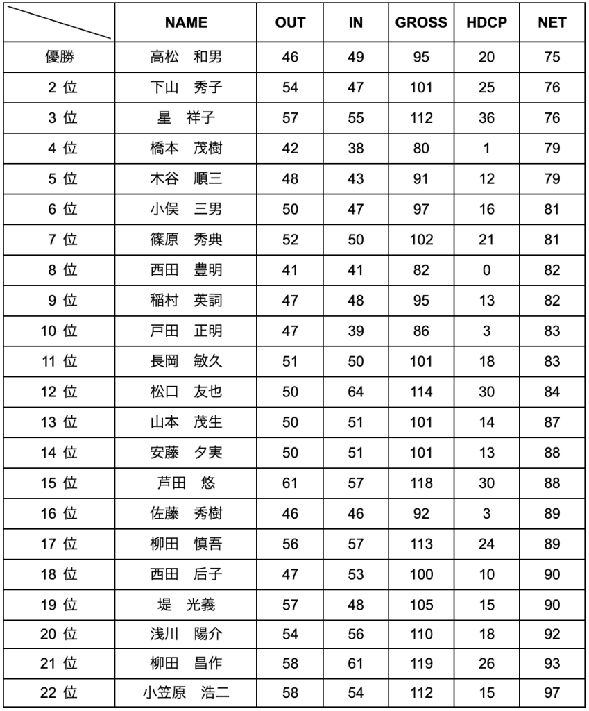 評 | 風が時折吹くも、快晴 気温16°と、絶好のゴルフ日和。男性青マーク、70歳以上白マーク、女性赤マーク。久しぶりの参加、山本茂生氏は、 藍綬褒章を受けられたという事です。おめでとうございます。篠原秀典氏。小笠原浩二氏、また、初参加芦田悠氏が加わった中、賑やかに執り行われた。グロス80で、ベスグロの橋本茂樹氏、70代は0という全体的にスコアーが悪い中、前回、ハンディーキャップ改正で10から20になった高松和男氏が46 49 95 HDCP20のネット75の3オーバーで優勝を勝ちとった。たまにはこうでなくっちゃ。2位には、日々ゴルフのレッスンをうけ、コツコツと練習とコースで力をつけてきている下山秀子嬢が、2位となった。第81回大会で優勝している下山秀子嬢は、ドラコンもとり、当たりが3本しかないダービーのうち2本と取るというご褒美。地道な努力は報われる。 |