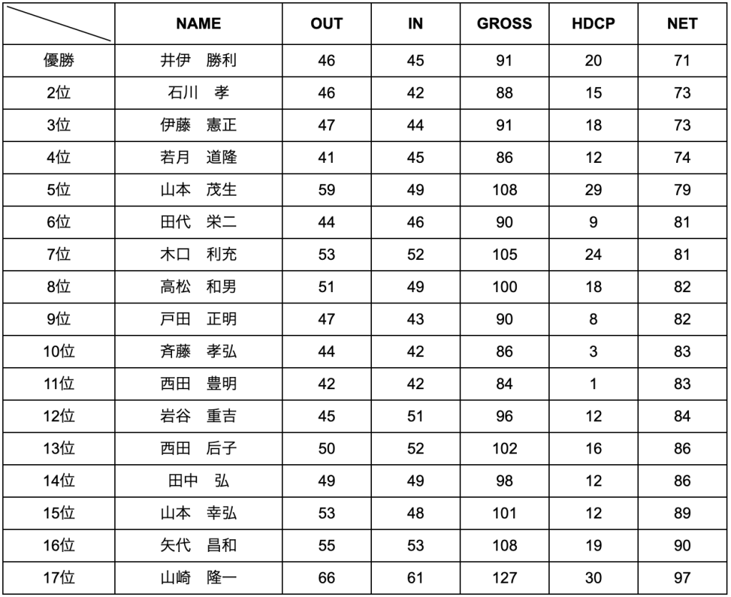 評 | 参加者17名のうち4名が初参加。 (伊藤憲正氏、高松和男氏、山崎隆一氏、山本幸弘氏)今回 井伊勝利氏が優勝したが、実は平成1年1月に初優勝しており、ハンディーキャップが本来13だったのが幹事の手違いで20のまま優勝となった。今後こんなことが起きないようにきちんとやります。今回は、初めてのSTG会初の快挙。ホールインワンがでました。パンパカパーン!岩谷 重吉氏です。おめでとうございます。 これにより、これからホールインワンをした方には、参加者全員から3000円のお祝儀を集め、贈呈します。これによる返礼は一切いりません。次回幹事は 石川、西田、長岡 11月8日千葉総成カントリークラブを予定する。 |