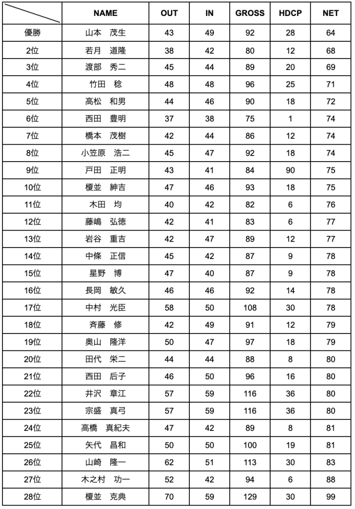 評 | 参加者28名は、最多。なぜか伊豆下田CCでの開催は人気が高く 出席率が高い。1泊2日で皆がクラブのロッジで和気藹々とした ムードで集い酒を酌み交わす楽しみがあり、帰りには下田の干物を 買って帰る。 当日は暖かく風もなく好天に恵まれた中、眠っていた虎の子が目覚め? HDCP28の山本 茂生氏がネット64の断トツ優勝で幕を閉じた。 馬券は、前評判高い竹田稔氏、山本茂生氏だったのが、歩兵若月道隆氏 が入り、大荒れの8000円をつけた。次回は3月中旬埼玉か千葉の予定。 |
