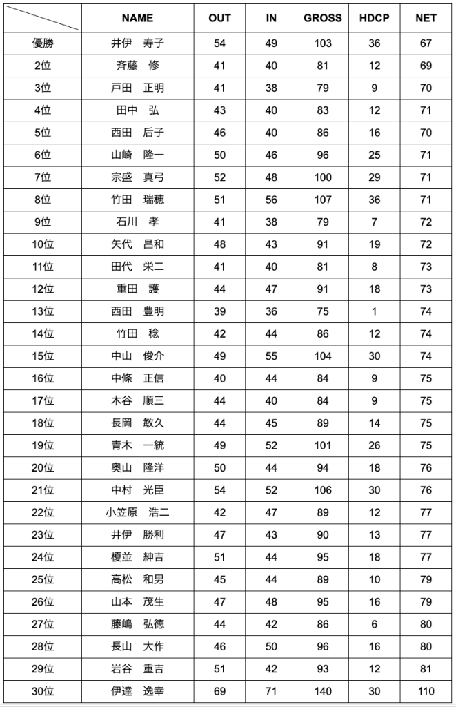 第30回ということで、1泊2日で、軽井沢72 GCで開催された。30名の参加者を得てみんなわくわくドキドキ。前夜は軽井沢プリンスコテージに宿泊し楽しい夕べを満喫した。初参加は長山大作氏、青木一統氏、伊達逸幸氏 映えある30回の優勝を飾ったのは、 元皇后杯チャンプ 井伊寿子嬢 54 49 103 ハンディーキャップ36 ネット67の5アンダー。さすがもっています。素晴らしいの一言。旭化成テニス部監督 伊達逸幸氏から提供された旭化成のカシミロン毛布や、NHKからの記念品などが賞品として提供され、パーティーも盛り上がり素晴らしい30回大会となった。