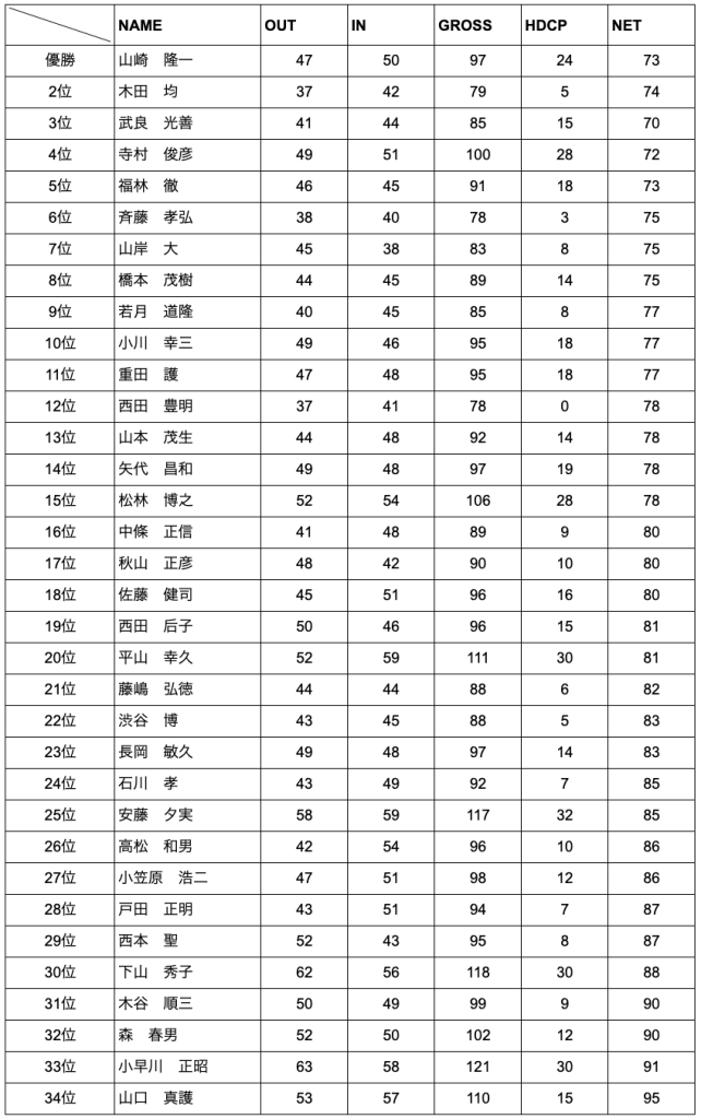 評 | 過去最多の参加人数9組34名を記録した。ゲスト 西本聖 福林徹 小早川正明 武良光喜 小川幸三 渋谷博 寺村俊彦 初参加 平山隆久 佐藤健司 下山秀子 松林博之 ソフトテニスの発展を考慮した海部俊樹杯を更に盛り上げていく為にも各界のリーダー、協力者をSTG会員を中心に募っていく、広い視野からソフトテニスを見つめていこう。 優勝は堅実なゴルフ、47 50 HDCP24 ネット73の1アンダーで、山崎 隆一氏が今までの下積みを一気に爆発させて初優勝した。ご立派。本当におめでとうございました。 |