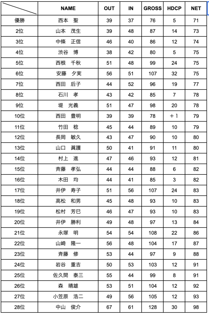 評 | 前回の第38回大会で優勝した西本聖氏が、39 37 HDCP5 ネット71の1アンダー。ベスグロ賞と共に連続優勝という快挙。またドラコン、ニアピン、ダービーとすべてを手中にした。巨人の星、元プロ野球選手としては当然といえば当然だろうが・・・。2位は山本茂生氏 長いバックティーからのOUT39は立派で、知性派を匂わせるシニアゴルファーです。3位は久々の参加の新潟のプレスリー中條正信氏。3位入賞でご満悦。今回は埼玉高体連より村上進氏、松村芳巳氏、永塚明氏、竹田稔氏の義父佐久間泰三氏、西田后子のママ友西根千秋氏が初参加とした。埼玉の斉藤修氏が新高梨2箱、西本氏、佐久間氏がゴルフボール。中山氏からNHK時計を賞品として提供してくださいました。来年7月のハワイゴルフコンペ開催のお知らせ、参加不参加の返事の用紙を配り、当日15人の参加意思があることを確認した。 |