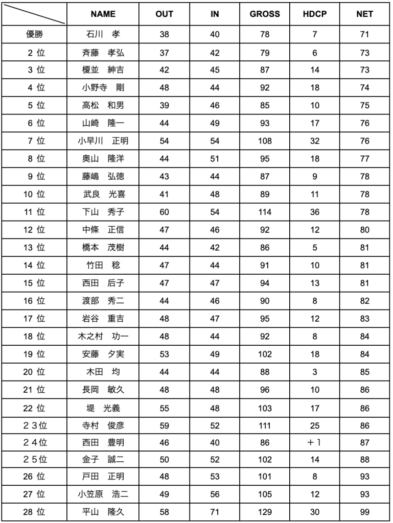 参加者28名7組で、大多喜城ゴルフ倶楽部の東コース、中コースから男性バックティー女性赤マークからスタート。3月は花粉症の季節、大多喜城は至る所杉の木だらけ。薬をのみのみ、花をかみかみ、辛い症状とも戦いながらも、今回の優勝者は6年ぶり、2回目の石川孝氏。日頃のゴルフ三昧の成果とのこと。日体大ソフトテニス部の卒業旅行でのゴルフコンペでホールインワンを経験した平山 隆久氏はブービーメーカーでした。ゴルフの厳しさを実感した1日だったでしょう。これからの成長を期待します。