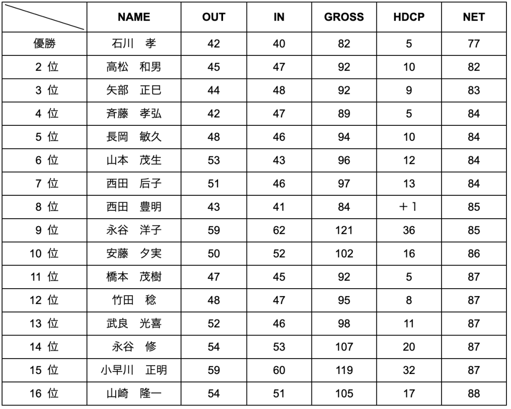 評 | 突風と雨の吹き荒れる最悪の嵐という超悪天候の中、日頃の行いが悪かったのか、運命のいたずらに身を任せて16名の勇者はスタートしていった。今回初出場の永谷脩氏の夫人永谷洋子氏もこの嵐の洗礼を受けられました。昼からますます風もひどくなり、横なぐりの雨、グローブを絞り絞り、悪戦苦闘の中、優勝したのは、日々ゴルフに魂をうばわれている男、石川孝氏でした。42 40 82 HDCP5 ネット77の5オーバー。第26回大会、第43回大会、につぎ3回目の優勝でした。今夜は眠れませんね。こんな嵐の中でのゴルフだったのにもかかわらず、終わるとみんなニコニコして、なぜか、口々に「楽しかった。」と、言っていた。6月1日に開催される海部俊樹杯の案内を配り、会第50回大会を来年7月頃とする計画を伝えた。 |