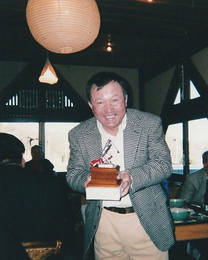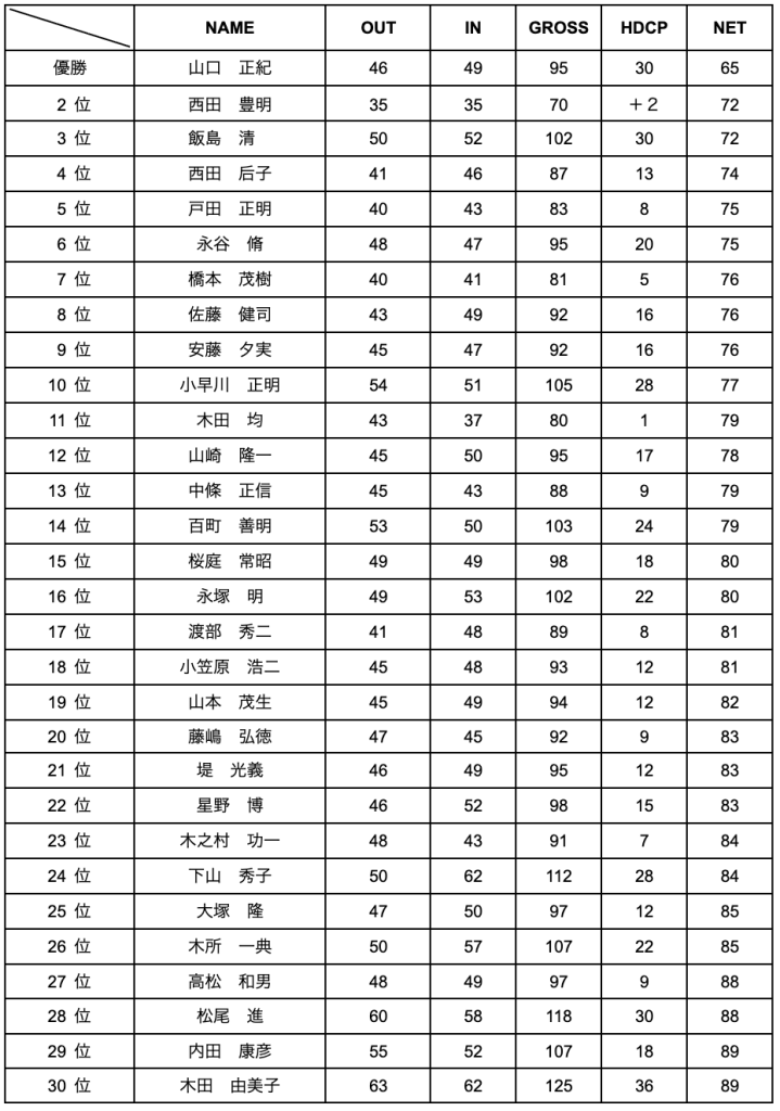 参加者30名。2年ぶりの下田CCでの開催。恒例の前日練習ラウンドは、小雨と寒さの中、14名が参加した。当日はナイスコンディションの中、やや速いベントグリーンでのプレイとなった。前日の練習ラウンドのミニコンペで優勝した山口正紀氏がHDCP30を武器に46 49 95 ネット65の7アンダーで本番でも優勝した。STG会うれしい初優勝だった。同じくHDCP30の飯島清氏が2位につけるかと思いきや、おっとまったー!と、コースを熟知した伊豆下田クラちゃん男、西田豊明氏が同ネット72 で飯島氏をおさえて2位を奪還した。飯島氏は、ドラコンを2つもとり、今回の入賞が刺激になったようで、「これからもますます腕をみがく!」と、調子にのっていた。ナガセケンコーを背負って立つ、橋本茂樹氏が福岡転勤が決まったとの報告。なんだかさみしいです。中條正信氏より新潟銘酒越乃寒梅が賞品として提供され、お酒も入りなめらかな口調でご本人の挨拶となった。NHKの萩原氏からもデジカメ、時計などの賞品提供がありました。ありがとうございました。