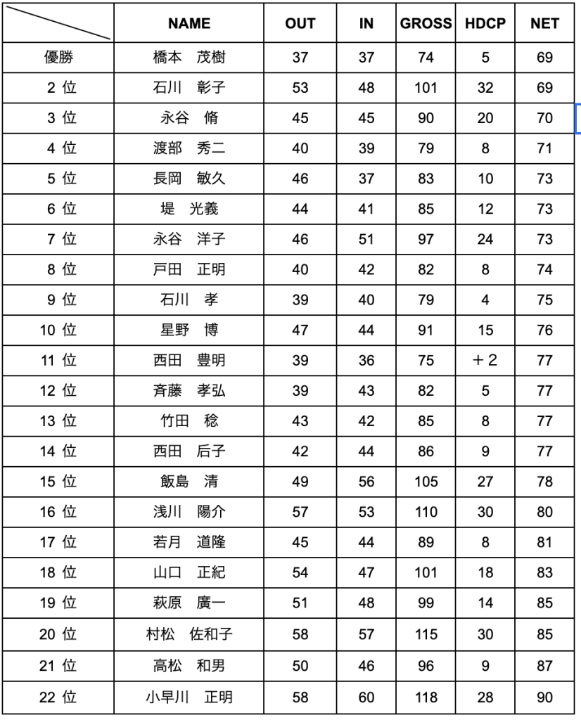 参加者22名。無風であたたかい最高のゴルフコンディション。初参加のNHKディレクター村松佐和子様、過去の天皇杯チャンプ浅川陽介氏を迎えて、男性緑マーク女性白マークから、西コース→東コースを回った。勝手知ったる大多喜城GC,ここは俺にまかせろとばかりに、苦節10年、3度の2位からの脱却を狙う橋本茂樹氏。のどから手が出るほど欲しかった優勝カップ。37 37 HDCP5 ネット69の3アンダーで、同率の石川彰子嬢を抑えてうれしい初優勝を飾った。福岡の単身赴任のびのび男は、ベスグロ37 37,ダービーもがっぽり。福岡から千葉へ直行したため、橋本夫人から携帯で、「あなた、今どこ?」橋本氏「今千葉のゴルフ場」夫人「‥‥。」せめて優勝した事が幸いしました。クラブを買い替えて参加するはずの田代栄二氏、テニスの試合が延びて欠席。残念無念。次回お待ちしています。NHK萩原廣一氏より賞品としてNHK置き時計、江戸切り子ガラスが提供されました。ありがとうございます。