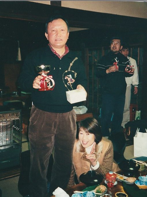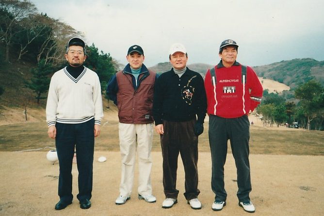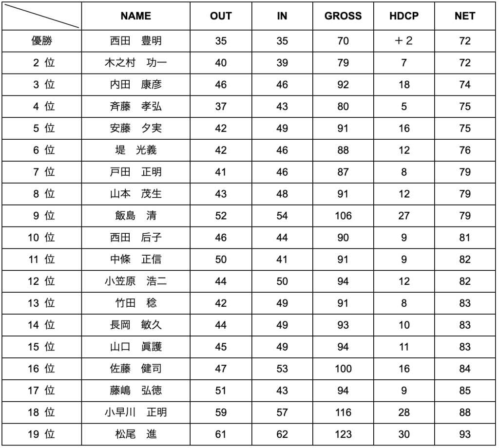 前夜の雨もあがり、無風の曇り空のなか19名がインスタート。優勝は+2ハンディーの西田 豊明氏が35 35 70のHDCP➕2のパープレー。同ネットの木之村 功一氏をおさえて、8度目の優勝を飾った。+2はあまりに厳しいハンディーキャップでかわいそうだという声もあった中、そのままで耐えていたので喜びもひとしおだったようだ。年明けのハンディーキャップ改正をする。斉藤 孝弘氏が中條氏に未だ優勝がないことを理由に、ハンディーキャップを増やすことを提案し、91をたたいた中條 正信氏が、しぶしぶ9から12に。男の勲章、ハンディーは下げたくないが、死ぬまでに優勝はしたい….。プライドもあるし…..。見栄もある‥‥。男はつらいよ。寅次郎〜。中條氏、藤嶋氏の熱川駅5時半必着を考慮し、プレイ終了後干物を買いに行くチーム。爪木崎の水仙郷チーム(山本、小早川、山口、長岡)に分かれ、山桃茶屋4時集合。食事、表彰式もテキパキ進み、5時15分にはおひらきとなった。今回は、ディフェンディングチャンプの橋本氏が仕事の都合で不参加。萩原氏、中條氏からの6本の寒梅、山桃茶屋からフレッシュ生オレンジジュース、らっきょう漬け、梅干し瓶詰めなど盛りだくさんの賞品提供がありました。皆大喜びでした。なぜか山桃茶屋で締めくくられると充実感と満足感が倍増するのです。