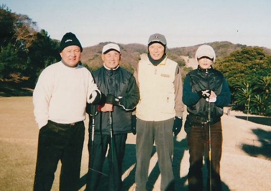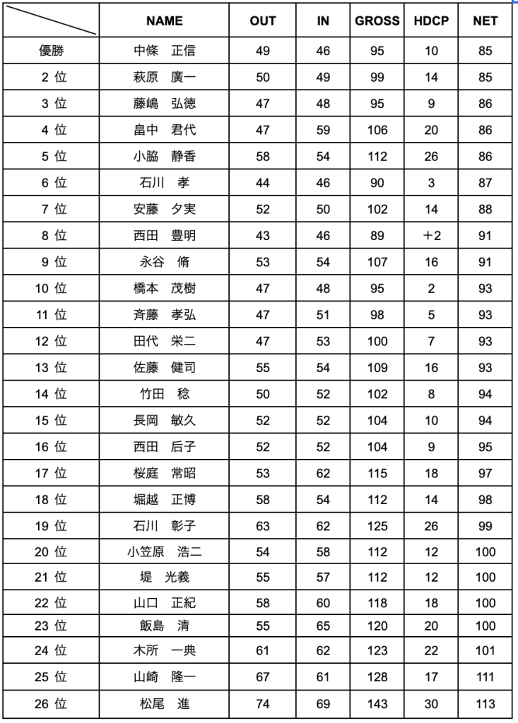 評 | いつも猛烈な風や寒さがこりごりなのか、珍しく前日の自主練習ラウンドはなし。前夜の泊まりは18人。当日は26人が結集した。本番当日、またもや前年同様下田名物の強風の為、スルーで周り、2時10分にフィニッシュ。その後、ゴルフ場から近い人気店「びゃく」に行き、表彰式を行った。地の魚のにぎりや、名物のそばをいただき、つらいラウンドを癒した。強風でニアピンは4つのうち2つは該当者なし。参加者26人中100超えが19人という大荒れスコアーの中、苦節24年、新潟のプレスリー中條正信氏がHDCP10,49 46の95 ネット85の前代未聞、13オーバーで念願の待望の初優勝をやっとやっと獲得したのだった。これで今までのうっぷんがはらせますね。中條氏からは寒梅、橋本氏からは霧島、NHKの萩原氏から時計やシャツ、キャップが賞品として提供された。またこの嵐の中のスコアにより、罰金はこちらも前代未聞の5万4千円にもなった。 |