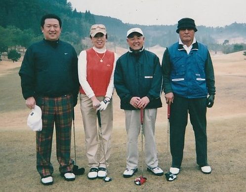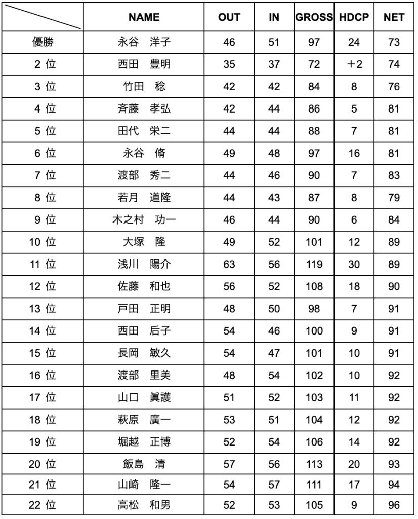 評 | 初出場は、渡部秀二氏の奥様 渡部里美嬢 佐藤和也氏を含む22名の参加。杉の木に囲まれた大多喜城GC。花粉が飛び散る季節なので雨でよかった。しかし、グリーンが大変難しく悪戦苦闘の中、元青山学院ソフトテニス部卒、永谷洋子嬢がHDCP24,グロス 97、ネット73の1オーバーで第54回大会に次ぎ、2度目の優勝を勝ち得た。2位には、前日、永谷夫妻と勝浦東急GCでプレーし、ホールインワンを出した西田豊明氏が。(ゴルファー保険50万円ゲットの予定。)22名中12名が100以上を打つ中35 37 のパープレーはご立派。また、ロングヒッター竹田稔氏が3位入賞した。今回も、HDCP5の壁にはばまれた斉藤孝弘氏は惜しくも4位と、入賞できなかったが、ドラコン1つ、ニアピン2つをとり、ご満悦のようすだった。 |