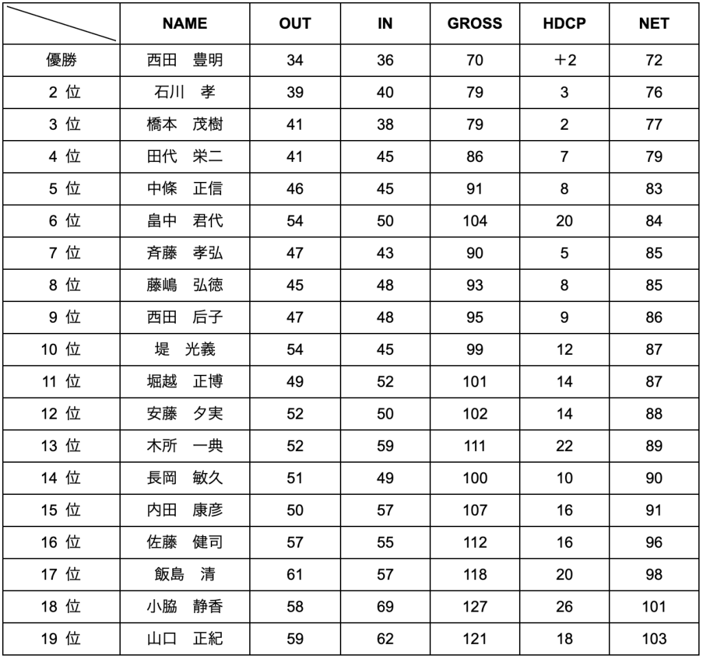 前日の練習ラウンドは、西田夫婦、橋本茂樹氏の3人とは、寂しい。ホテルサープロモントで、宿泊1プレーのパックを申し込んであったが、配電線の故障でホテルが使えなくなり、急遽、民宿「川久」に変更した。本番当日に下田に来る佐藤健司氏、堤光義氏、木所一典氏以外の16名が宿泊した。いつもながらの海の幸をとことん堪能した。当日は、暖かく風のない最高の天気の中、伊豆下田GCクラちゃん男、西田豊明氏が34 36 70 HDCP+2で2位の石川孝氏を楽々おさえて優勝した。3位には、博多から直行便で、橋本茂樹氏が石川氏と41 38 79の同グロス さすが、長瀬ケンコー営業ゴルフ部の橋本茂樹氏、 ドラコン2つニアピン1つをとり、るんるん上機嫌。B.Bの小脇静香氏、B.M の山口正紀氏は、「賞品があってよかったー!」と、たよりなげ。パーティーはいつもの熱川「山桃茶屋」で執り行われた。囲炉裏や、火鉢がいつものように迎えてくれ、お刺身や天ぷら、茶碗蒸し、小盛りそば、最後に甘ーいごまだれへらへら餅をいただく。中條正信氏から新潟銘酒 越乃寒梅3本、橋本氏から焼酎。他、干物や佃煮、参加賞には天城のわさび漬けなど盛りだくさんだった。次回は、房総CCでの開催が発表された。