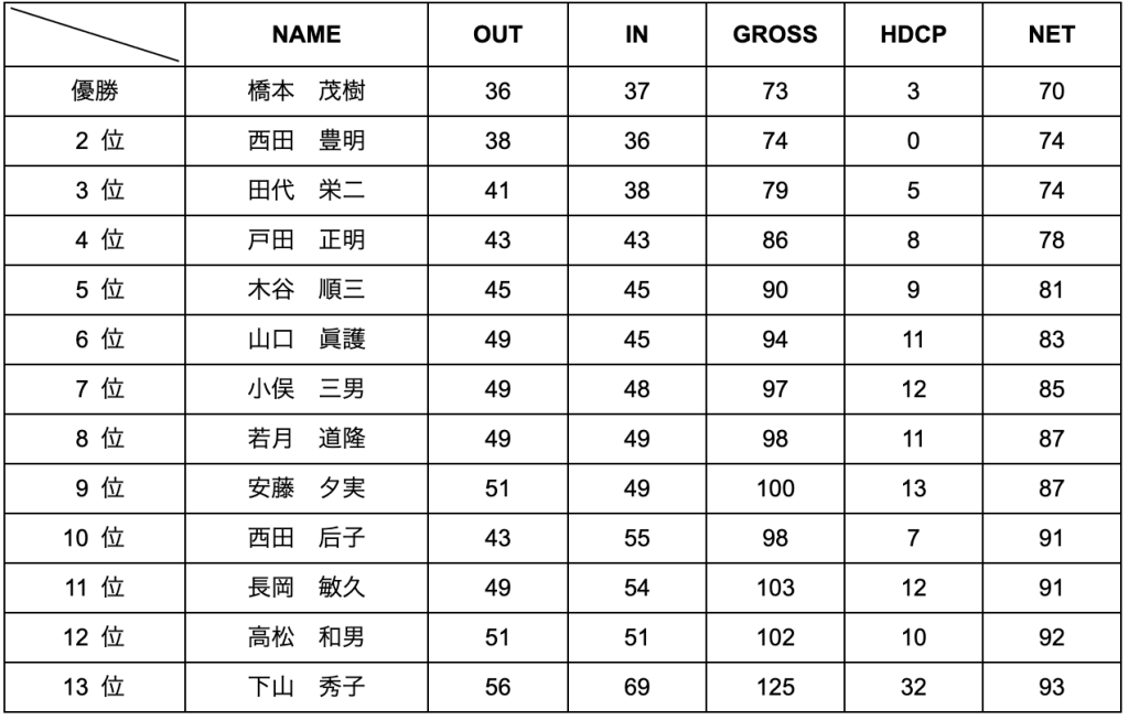 評 | 1978年、軟式テニス連盟理事長であった木田英夫氏と共に、STG会を立ち上げた斉藤孝弘氏が肝臓ガンのため急逝されました。斉藤氏は、明治大学ソフトテニス部の監督で長年ソフトテニス連盟の理事をされ、ソフトテニス界に深く貢献されました。当時、西田 時安がアジア大会などで優勝した頃のナショナルチーム男子監督で、西田にゴルフの楽しさを教えた人でもありました。斉藤孝弘氏の取り計らいで西田との結婚が決まり、仲人もお引き受け下さるなど、公私にわたって多大なる恩を賜りました。感謝に耐えません。故人のご冥福をお祈りいたします。朝の挨拶の後、全員で黙祷をし、全員が喪章をつけてプレーしました。 前日の雨とは一転、清々しく気持ちの良い天気の中、ドライバーよーし!アイアンショットよーし!パッティングよーし!ご本人「もう、上出来です。」と、ドヤ顔の橋本茂樹氏が、メンバーコース西田豊明氏を1打おさえてベスグロもとり、36 ,37 73 .HDCP3 ネット70の2アンダーで、12年ぶり、3度目の満を持しての優勝となった。35年勤めて今年退職した下山秀子嬢は、久々の参加で映えあるBM。お疲れ様でした。後半バンカー、OB で大たたきでべそをかいていた西田后子嬢はNP2こDC1をとったので、花より団子「ま、いいっか!」と、ご機嫌さん。今回は、西田家の近くの梨園のおいしい浜梨が参加賞として全員に配られた。 |