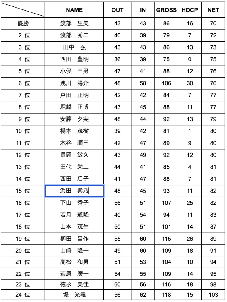 評 | 気候変動の激しい季節。運良く風も穏やかで、比較的暖かなゴルフ日和の当日。約1年ぶりのSTG会が、24名の参加者を得て、開催された。初参加は、ナガセケンコーの社長 柳田昌作氏。東北高校のソフトテニス部に今年入学した父兄である徳永美佳氏。そして華やか、女性5名が参加した。 当初、榎並紳吉氏、中津川澄男氏の出席予定が仕事で欠席になり、その代わりに浅川陽介 木谷順三氏がすべりこんだ。セーフ!東コース 中コースをまわり、ニアピン ドラコンなど各チームごと、和気藹々とプレーを楽しんだ。 結果は、渡部里美夫人がHDCP16 、43 43 の86。ネット70の2アンダーで余裕の初優勝。2位にご亭主の渡部秀二氏と仲良くワンツーフィニッシュとなり、賞品を独占した。 3位には久々の参加、田中弘氏。ベスグロには、富士小山のレジェンド西田豊明氏。B.Mの堤光義氏は、何に気付いてか、「これからゴルフレッスンに通うことにした。」と反省しきり。 萩原廣一氏、徳永美佳様からはカステラやきんつば、マロングラッセなどのスイーツが提供された。みな大喜びありがとうございました。 |